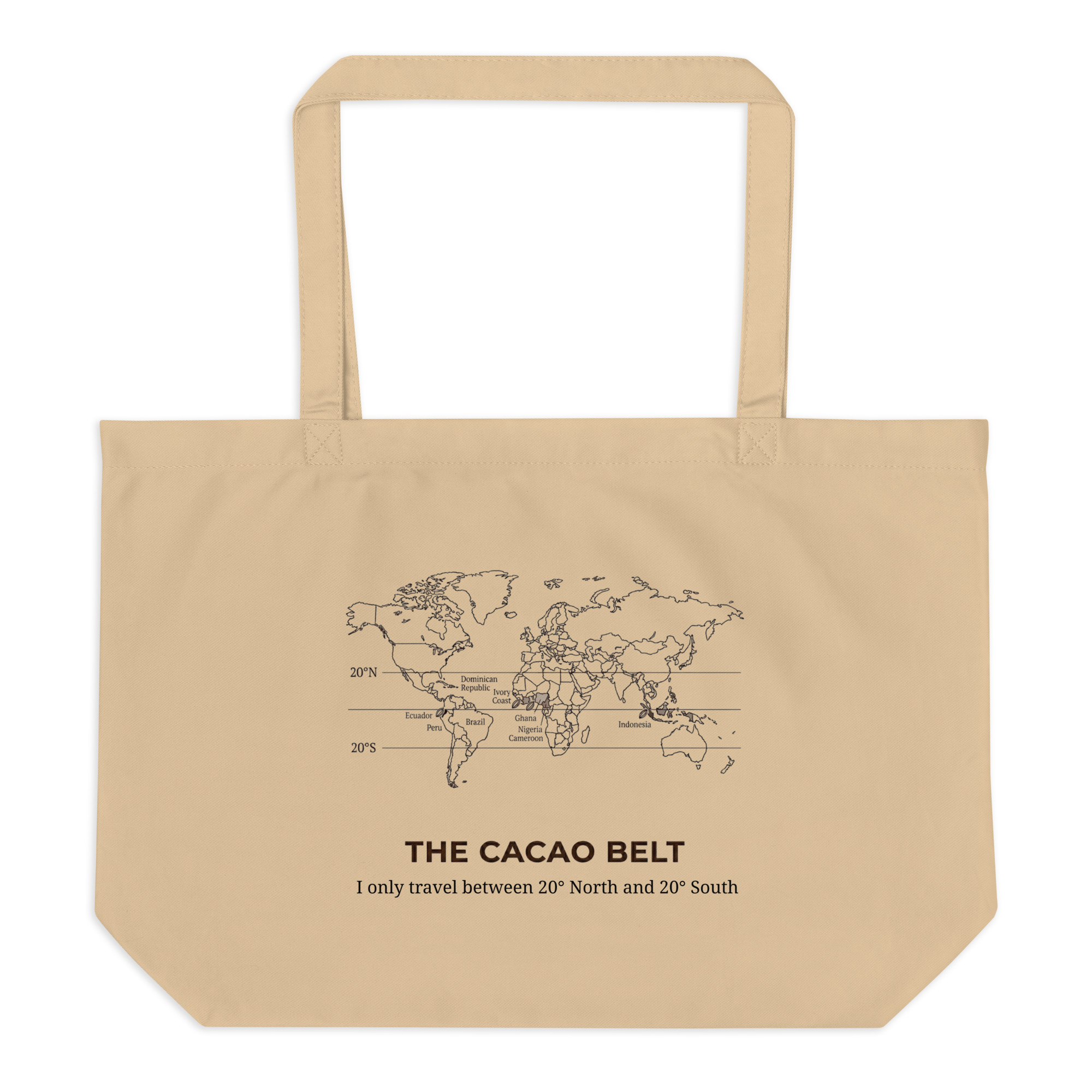 The Cacao Belt Travel Tote is for chocolate lovers who know exactly where the good stuff grows. Featuring our witty “I only travel between 20°N and 20°S” cacao belt map printed on both sides, this large organic cotton tote carries your essentials with quiet, well-traveled confidence.
