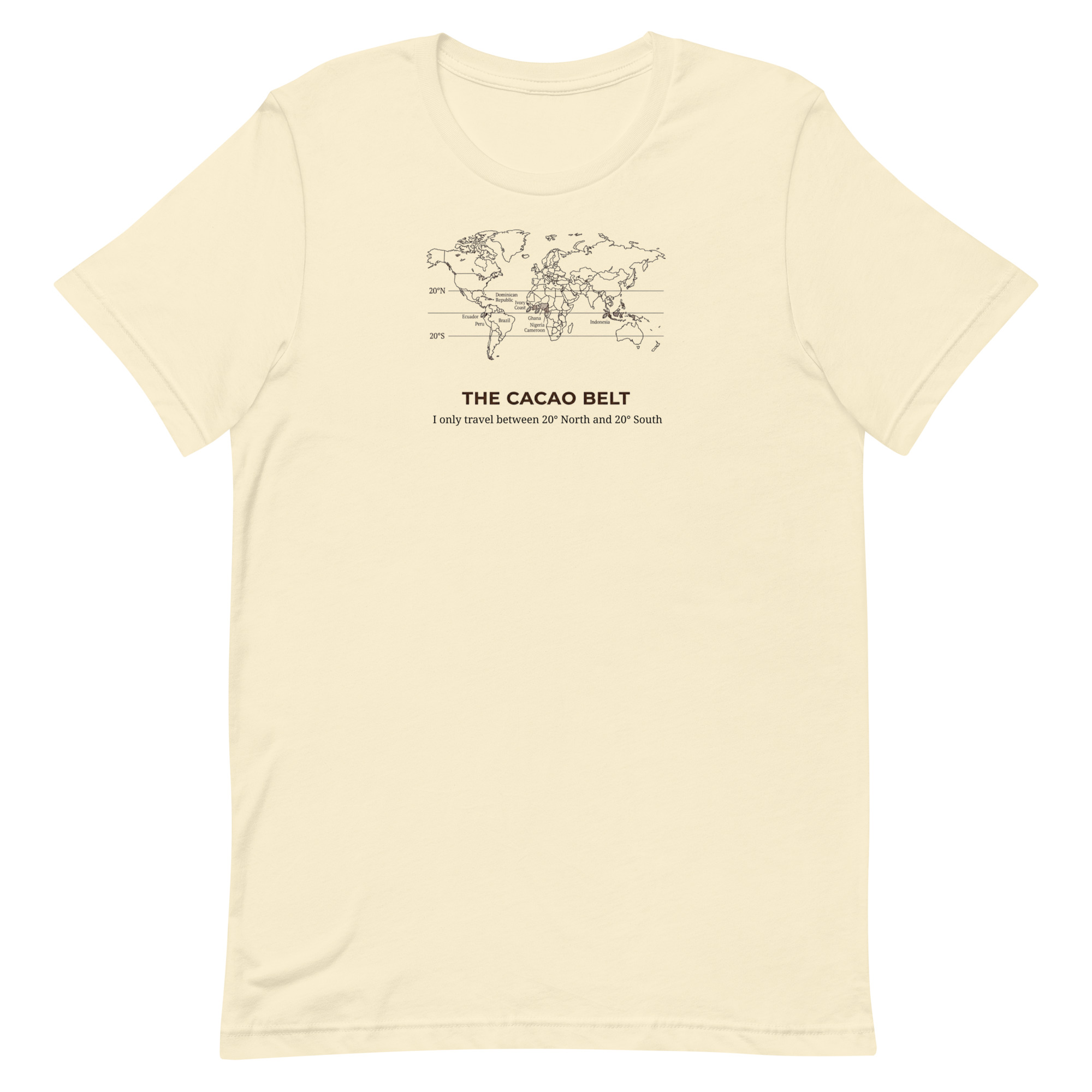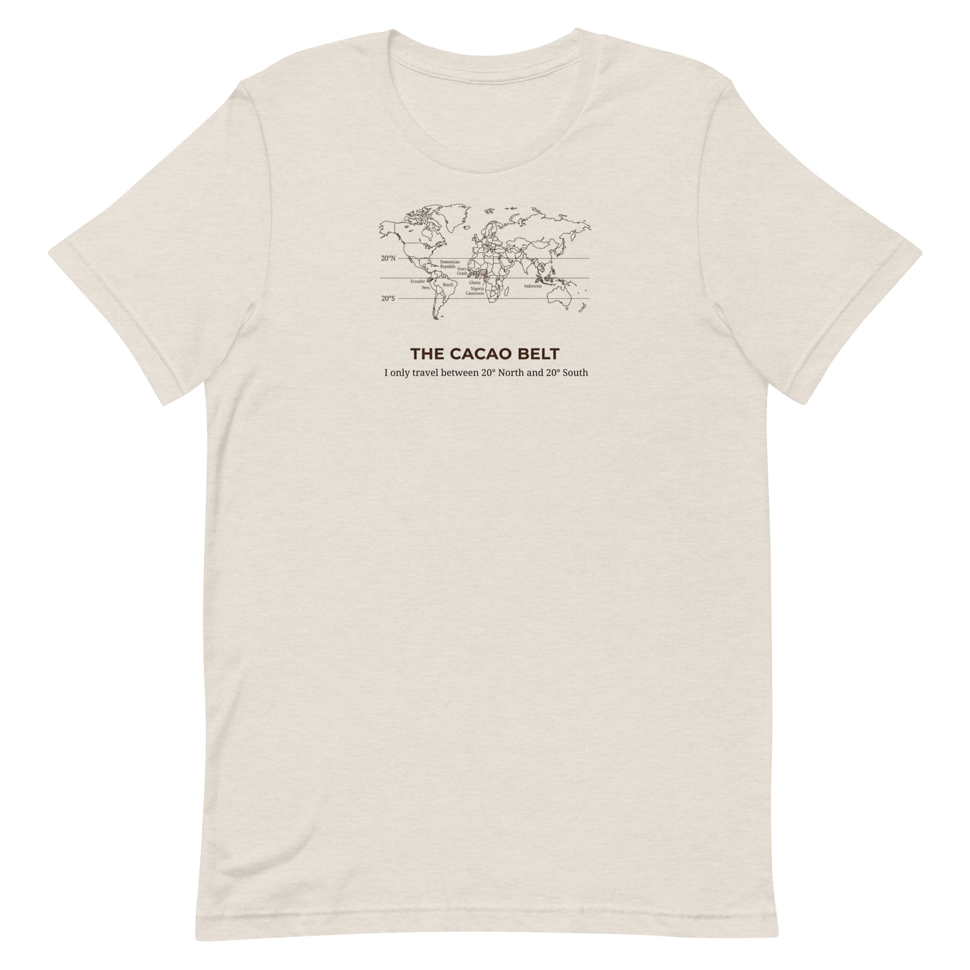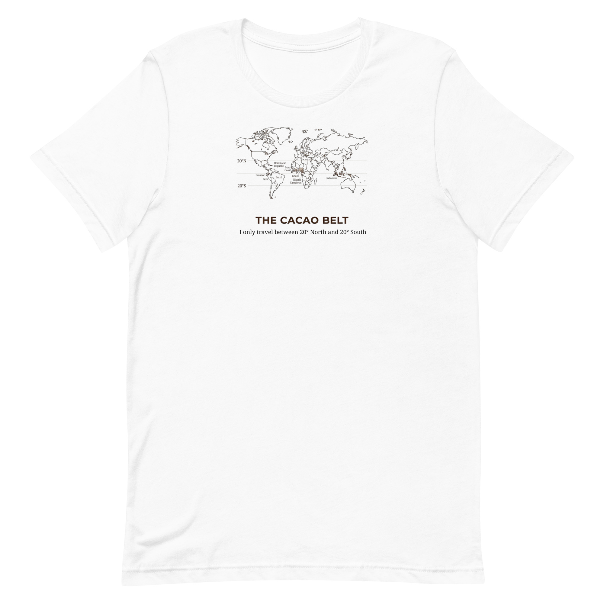 The Cacao Belt Tee is for chocolate lovers who know that great flavor starts in the tropics. Featuring our witty cacao belt map design, this shirt quietly celebrates the region where chocolate thrives  – roughly 20° north to 20° south – and the people who pay attention to that kind of detail.