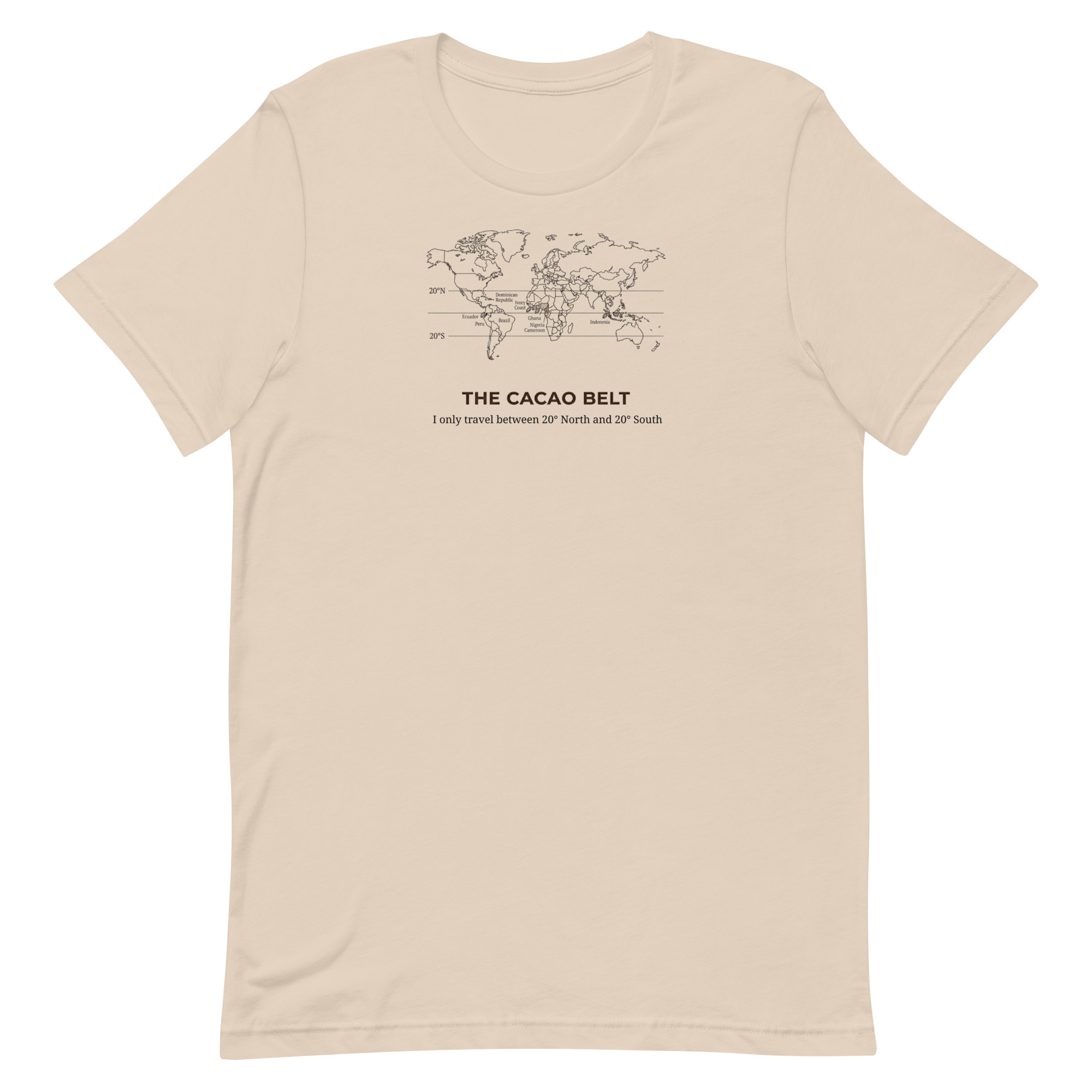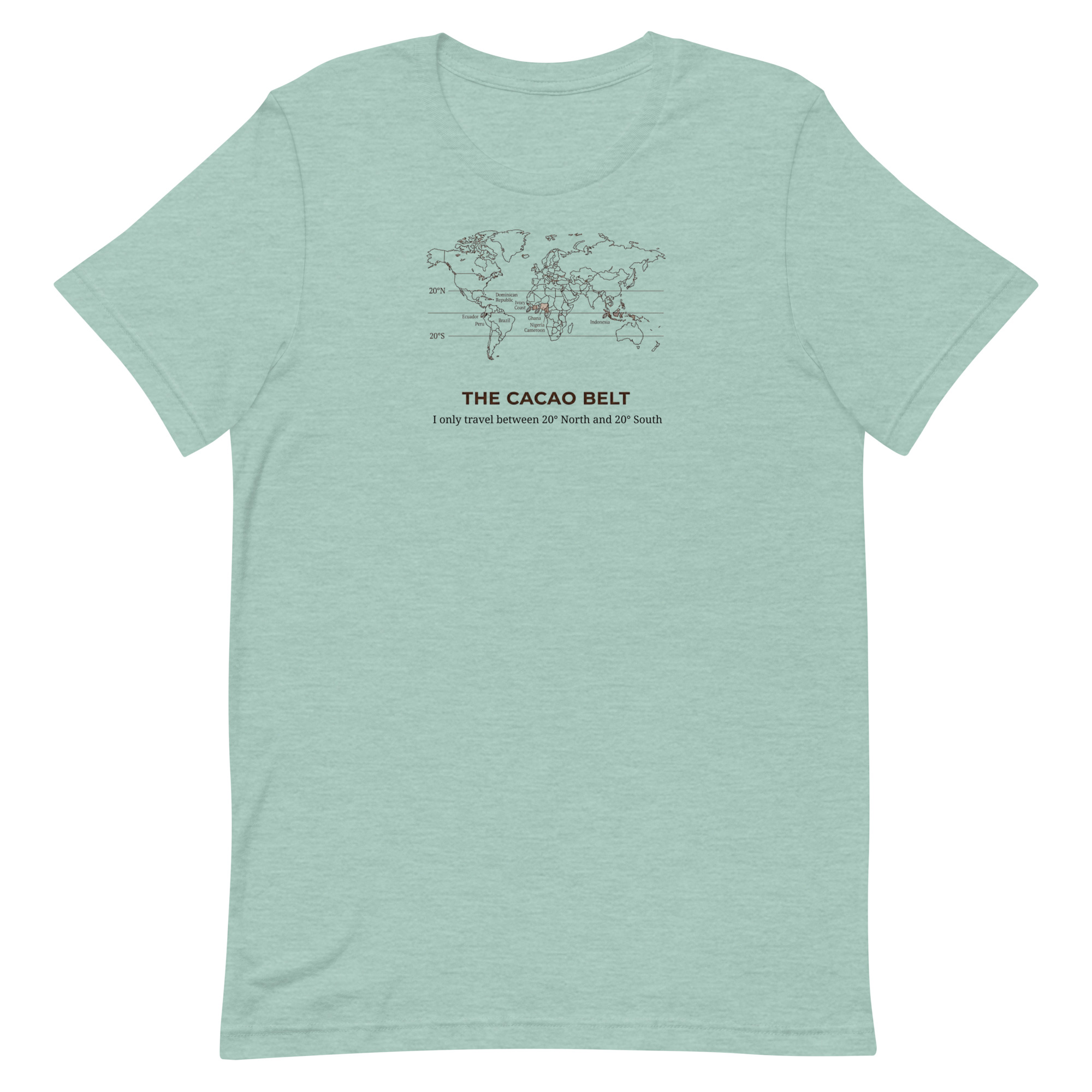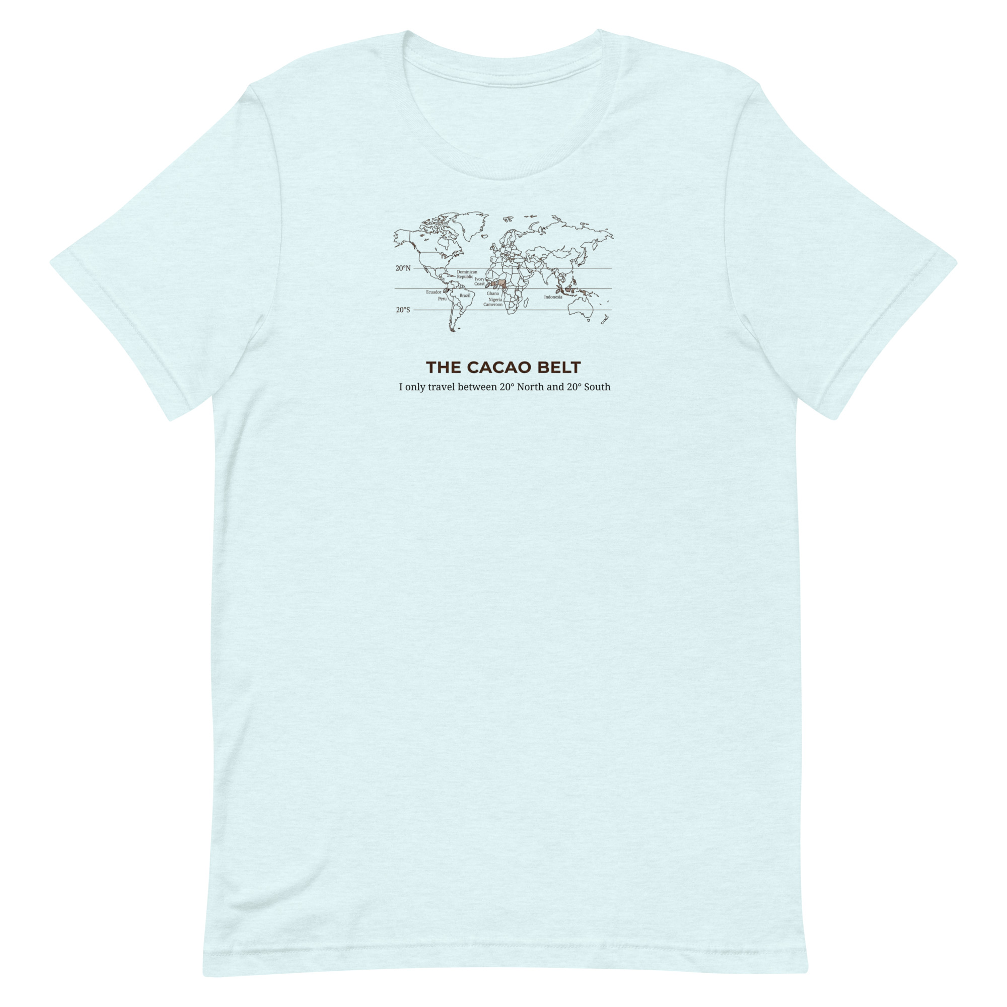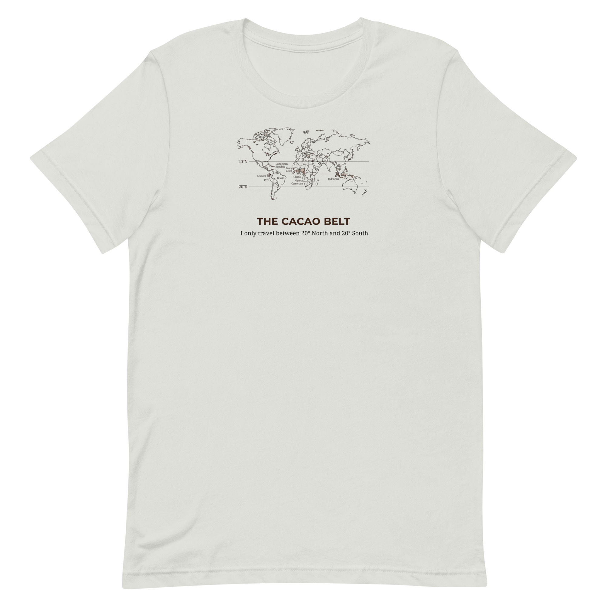 The Cacao Belt Tee is for chocolate lovers who know that great flavor starts in the tropics. Featuring our witty cacao belt map design, this shirt quietly celebrates the region where chocolate thrives  – roughly 20° north to 20° south – and the people who pay attention to that kind of detail.