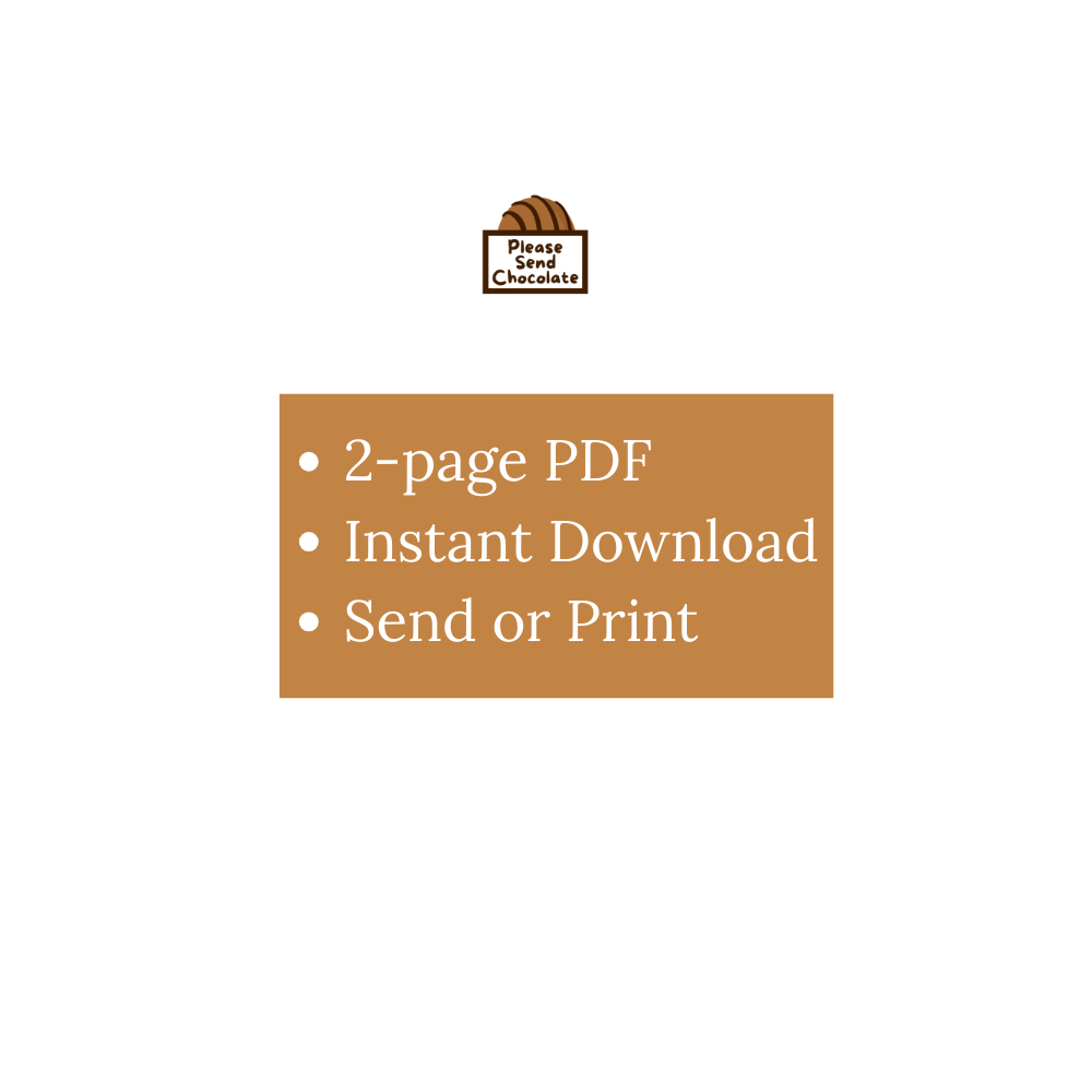 - Decide whether you’re sending it digitally or printing it. If digital, send the PDF (or a screenshot of the coupon page) and transfer the chocolate budget funds in the amount you choose. If printed, cut out the coupons and include cash or a gift card before delivering or mailing it.